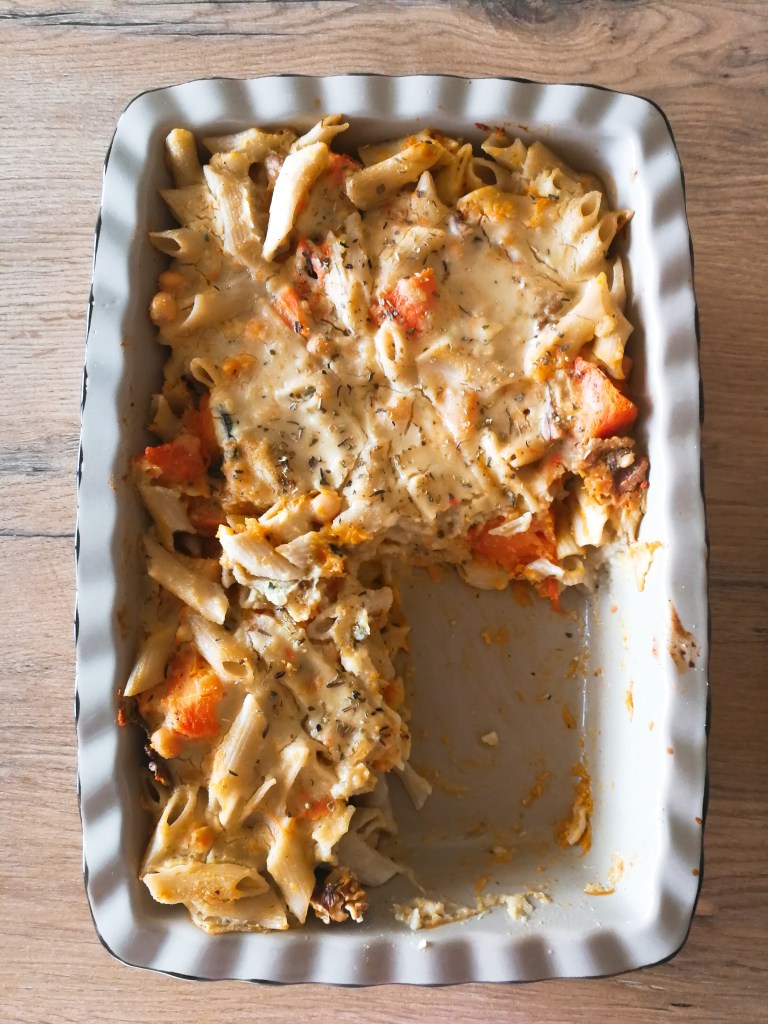 Zapečena kremasta tjestenina s bučom, hrskavim slanutkom i orasima