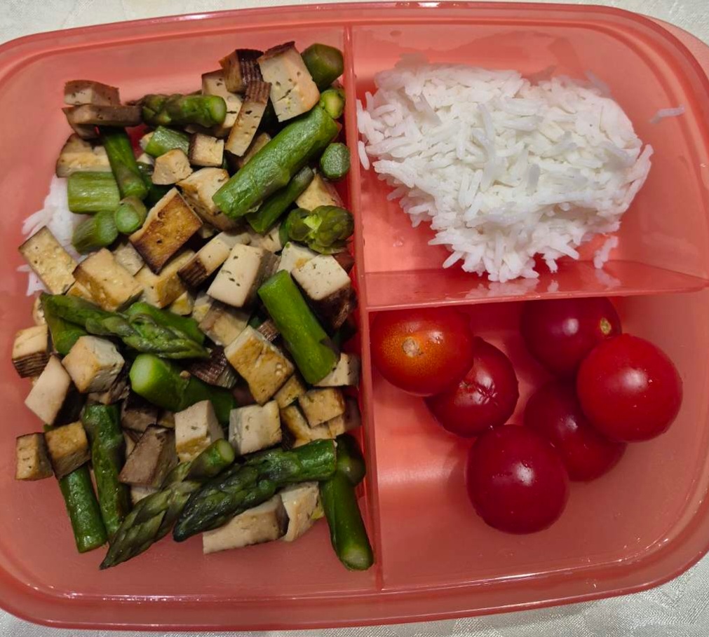 Basmati riža sa šparogama i dimljenim tofuom + cherry rajčice