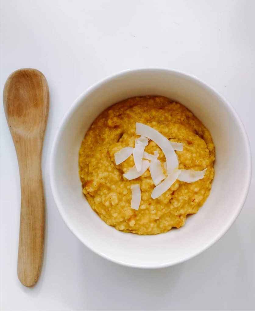 Sve zajedno kuhati na minimalnoj vatri, s poklopcem uz povremeno miješanje (cca 5 min) . Posuti čipsom od kokosa.