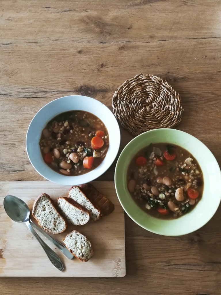 slijedi recept za vegetarijansku ili vegansku maneštru od ječma, povrća i graha.