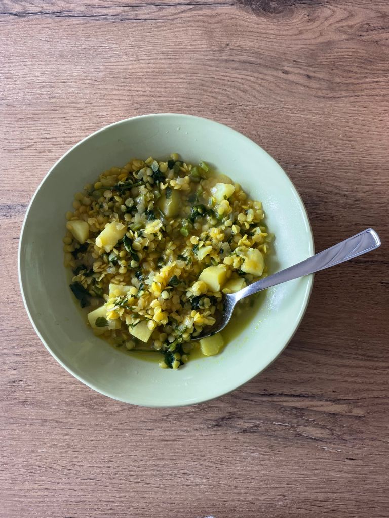 • Ručak: Varivo od leće i špinata + rikula s limunom i lanenim uljem, šnita raženog kruha