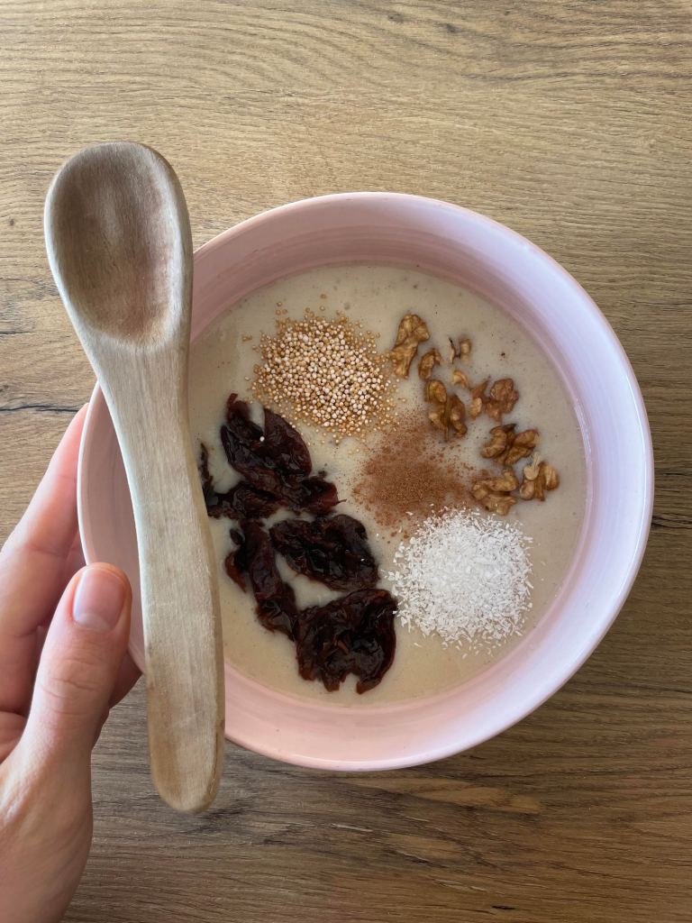 - Postepeno dodavajte mokre sastojke u suhe, uz konstantno miješanje. Ovisno o konzistenciji vašeg lana i kvaliteti kokosovog brašna, trebat ćete postepeno dodavati još vode, uz konstantno miješanje. Konzistencija smjese mora biti kao za malo deblje, “američke” palačinke.